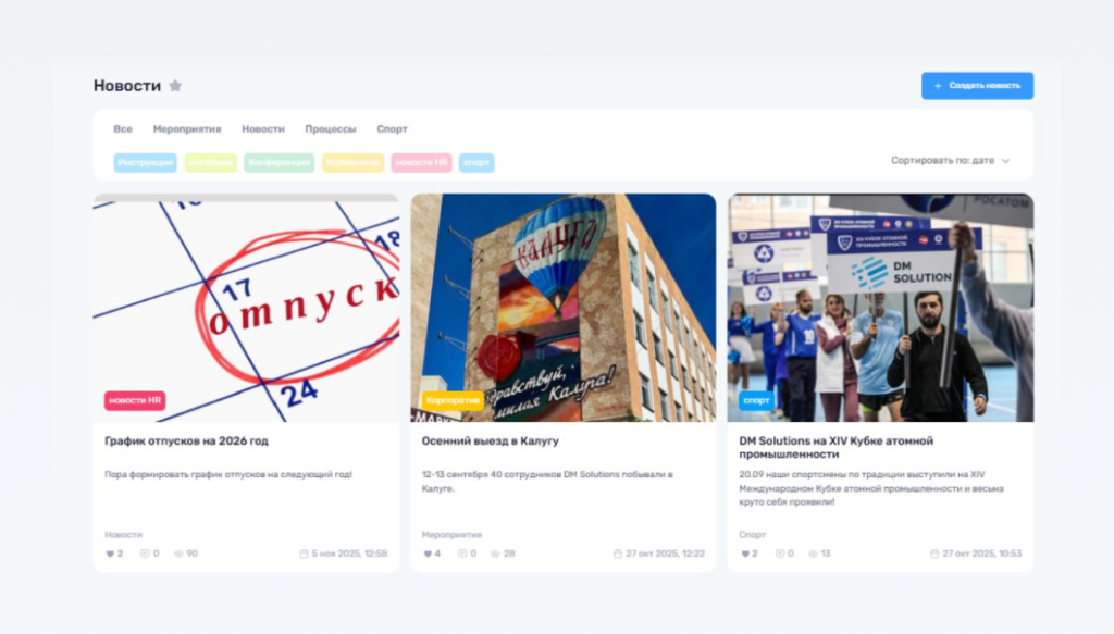 - Новости — важные анонсы теперь размещаются в корпоративном портале, избавляя чат в Telegram от информационного шума.