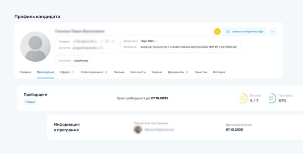 - Пребординг — кандидаты довольны прозрачностью действий, как текущих, так предстоящих. Все документы и данные загружаются в пару кликов, ничего не теряется.
