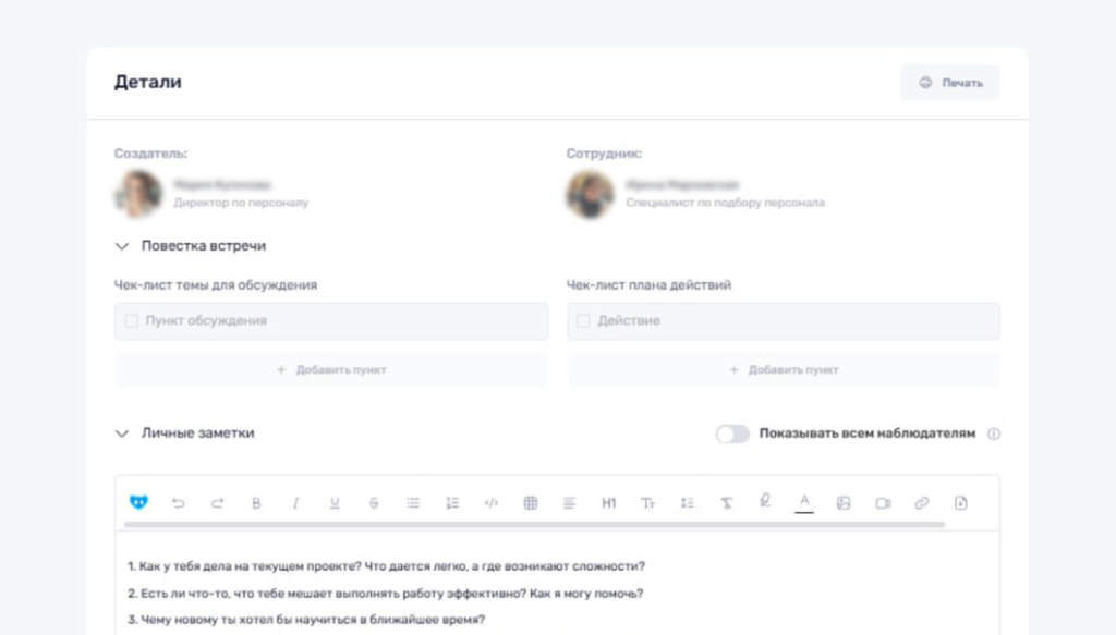 Используют для нескольких дирекции. Помогает не забывать о встречах, фиксировать договорённости. Сотрудники видят, что они не «брошены», а руководители имеют инструмент для регулярной обратной связи.